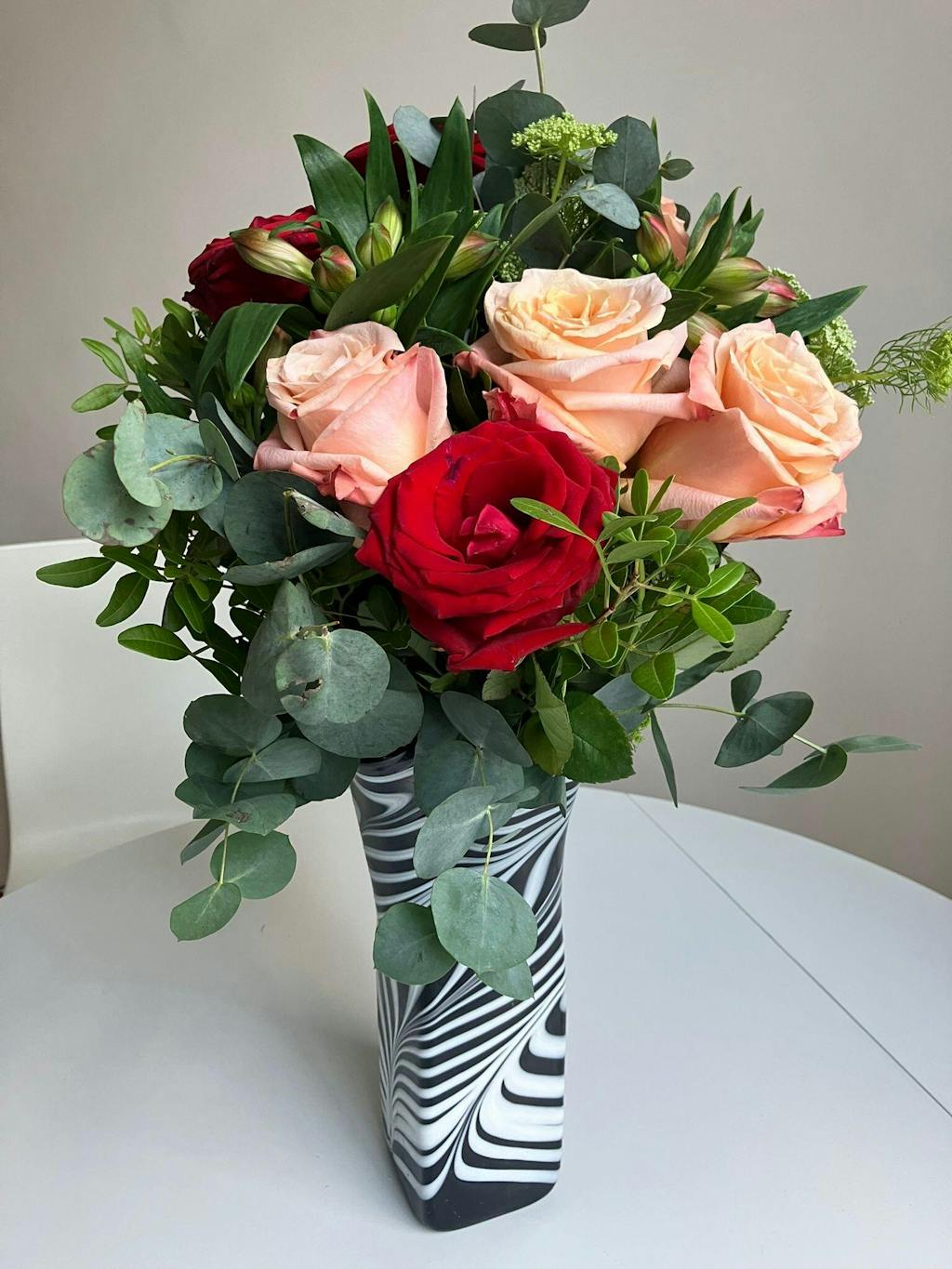 Wonderfully wild. Deep red and antique roses mixed with birch twigs, ivy and seasonal greens.