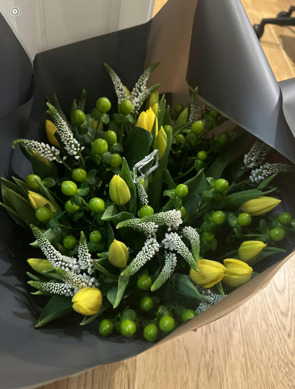 A bright and summery arrangement consisting of yellow roses, orange tulips (when in season), lilac/bouvardia and eucalyptus. (vases not included)